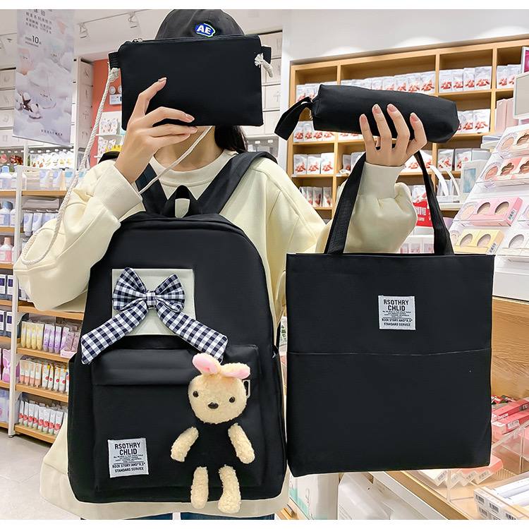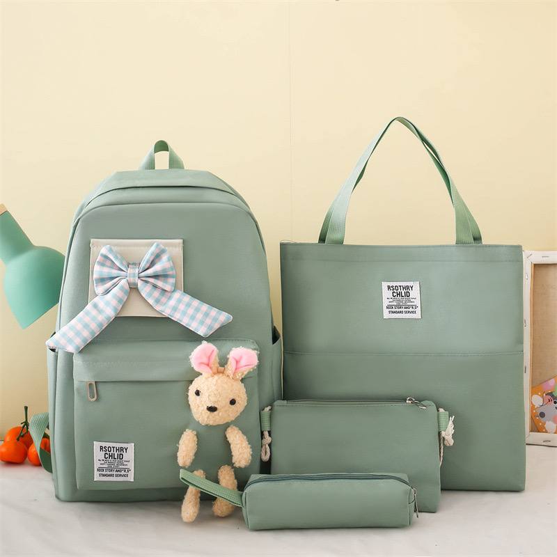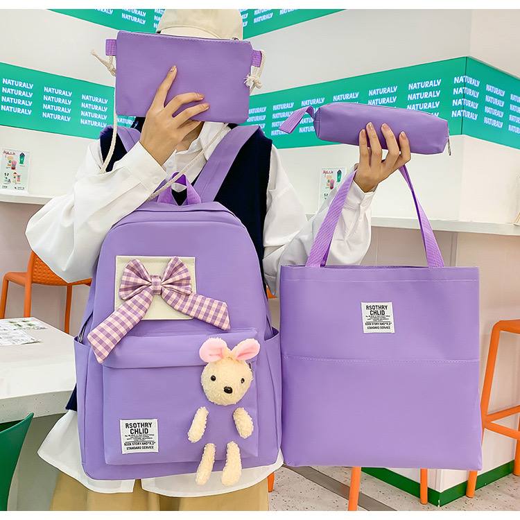• کولهپشتی اصلی جادار (با فضای کافی برای کتاب، لپتاپ و دفتر) • کیف دستی (برای کلاسهای سبک یا خریدهای دمدستی) • جامدادی همست • کیف کوچک کاربردی (برای موبایل، کارت یا لوازم آرایش) • به همراه آویز عروسکی بامزه که ظاهر کیفو خاصتر میکنه